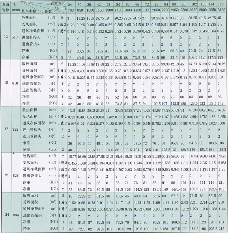 型號一一排數(shù)(片距代號)3.2——表面管數(shù)——表面管長(英寸)。