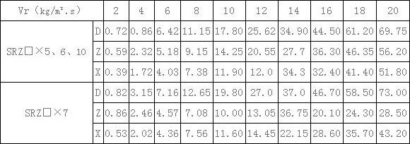 表1、SRZ空氣熱交換器(散熱器)熱媒為蒸汽時,在不同空氣重量流速下的傳熱系數(shù)K(kcal/m2.h.℃)